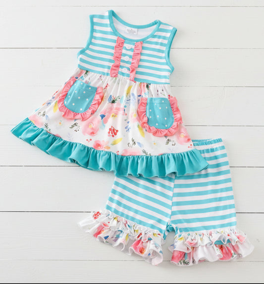 Aqua Blue & Yellow Floral & Check Ruffle Short Set