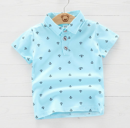 Aqua Blue Boy's Polo Short Sleeve Anchor Shirt, Back to School