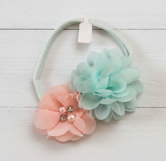 Aqua & Peach Flower Nylon Headband, girl, stretch, baby, child