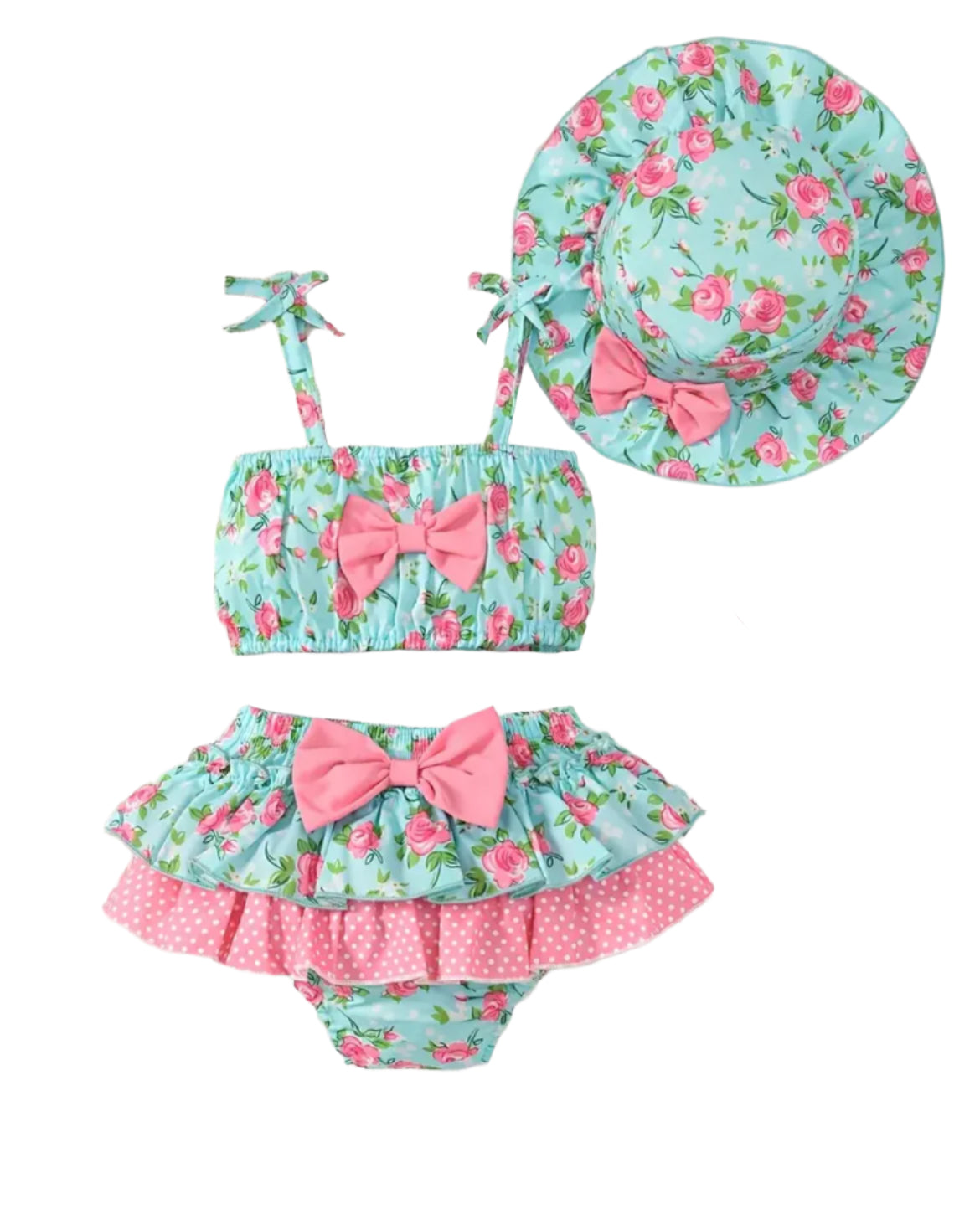 Top has blue background with pink roses and pink bow on front and elastic at top and bottom with ties. Pink and blue floral ruffle bottoms have elastic waist and legs and matching bow at waist. Matching sunhat completes this outfit.