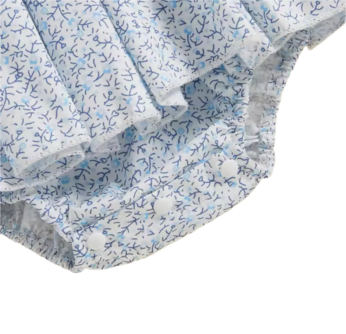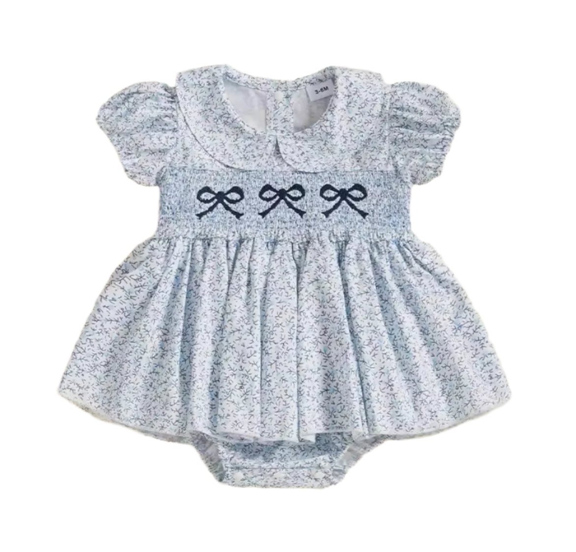 Blue & white flower top has cap elastic sleeves and embroidered bows on smocked chest and skirted bottom. Collared neckline, elastic legs and snaps at back and bottom make for easy changing. One-piece.