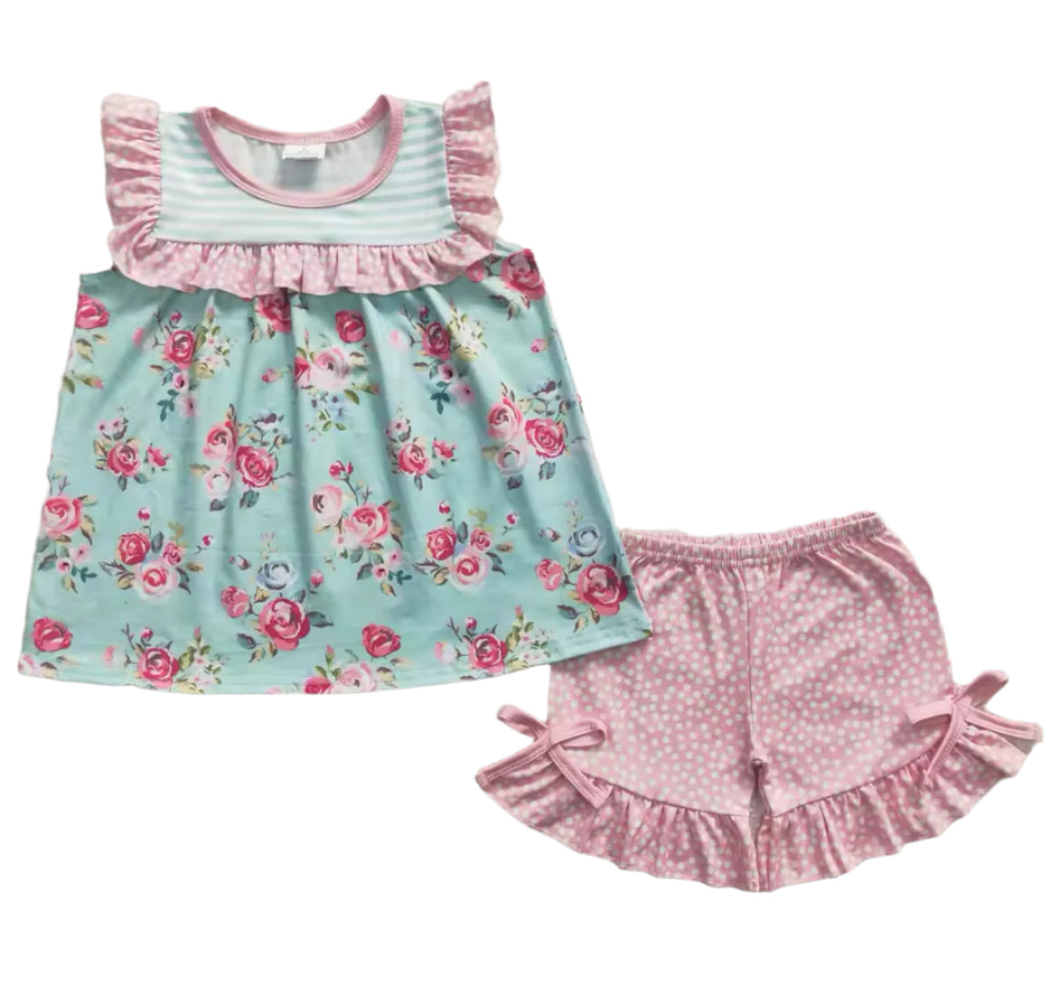 Cottage Rose Pink & Blue Ruffle Short Set, girl, kids, clothing, outfit / SALE