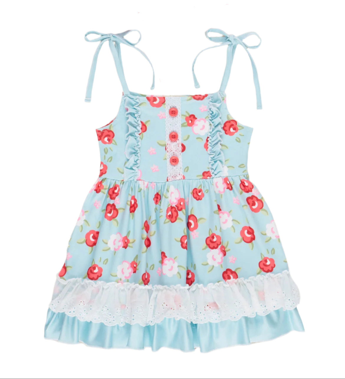 Red & pink rose print on light blue background. spaghetti strap dress has ruffle on top with lace & button accent and lacee ruffle at bottom. Milk silk fabric makes this dress buttery soft. She will definitely love this dress.