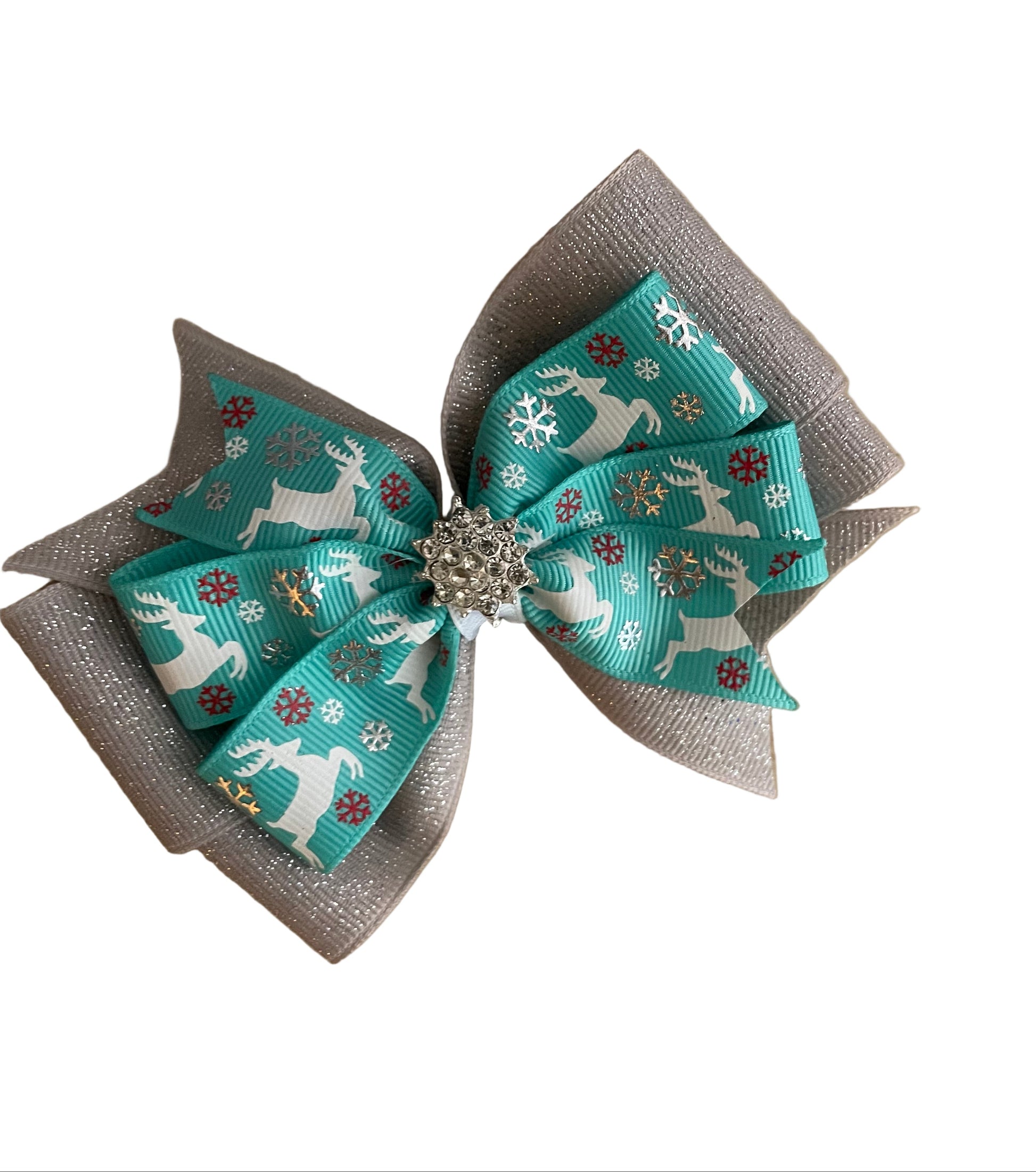 Silver glitter 1 1/2" grosgrain bow has a 7/8 inch teal bow with white reindeer & silver & red snowflake design on top. Precious rhinestone snowflake center adds that darling touch. Comes on a single-prong alligator clip, lined with a latex-free no slip gripper.
