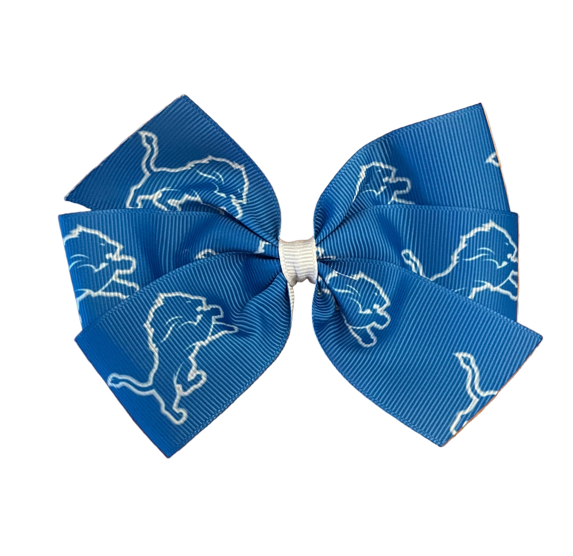 Grosgrain 1.5" ribbon has Honolulu blue background with white Lions. Comes on a latex-free, no slip alligator clip. Ends are heat sealed to prevent fraying. Measures approximately 4.5" in width.