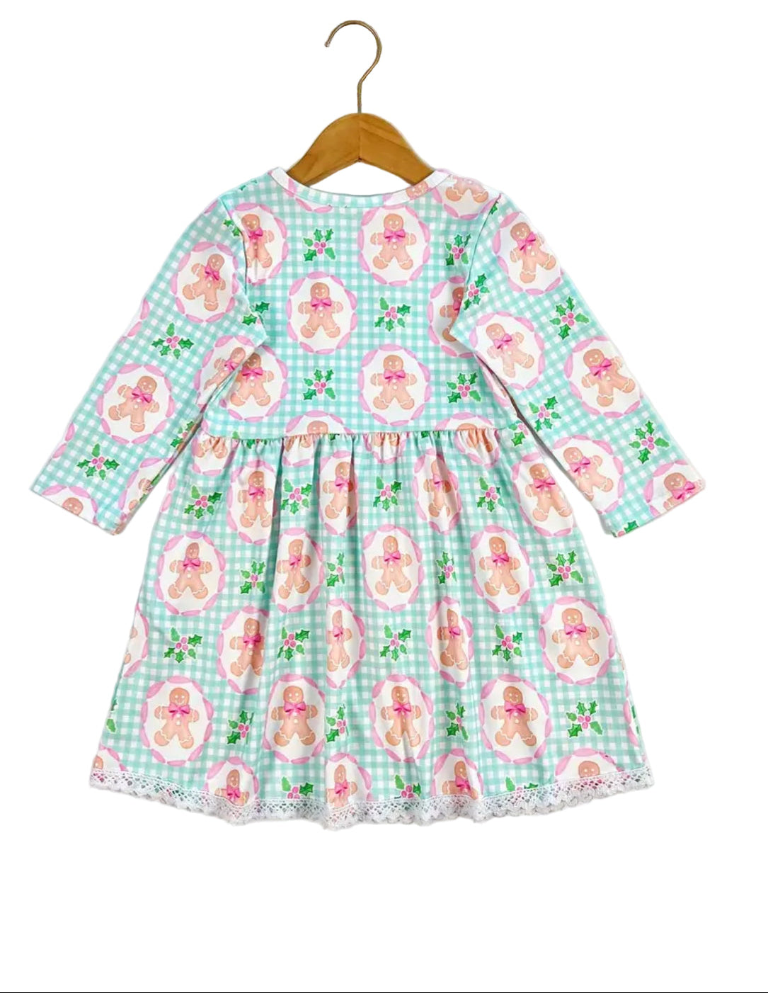 Gingerbread in pink circles on blue & white checked background and holly design Long sleeves and A-line skirt allow for plenty of twirling!! Milk silk fabric is soft and comfortable. She will definitely love this dress. Add a coordinating bow or knee socks for a completed ensemble! (Sold & listed separately)