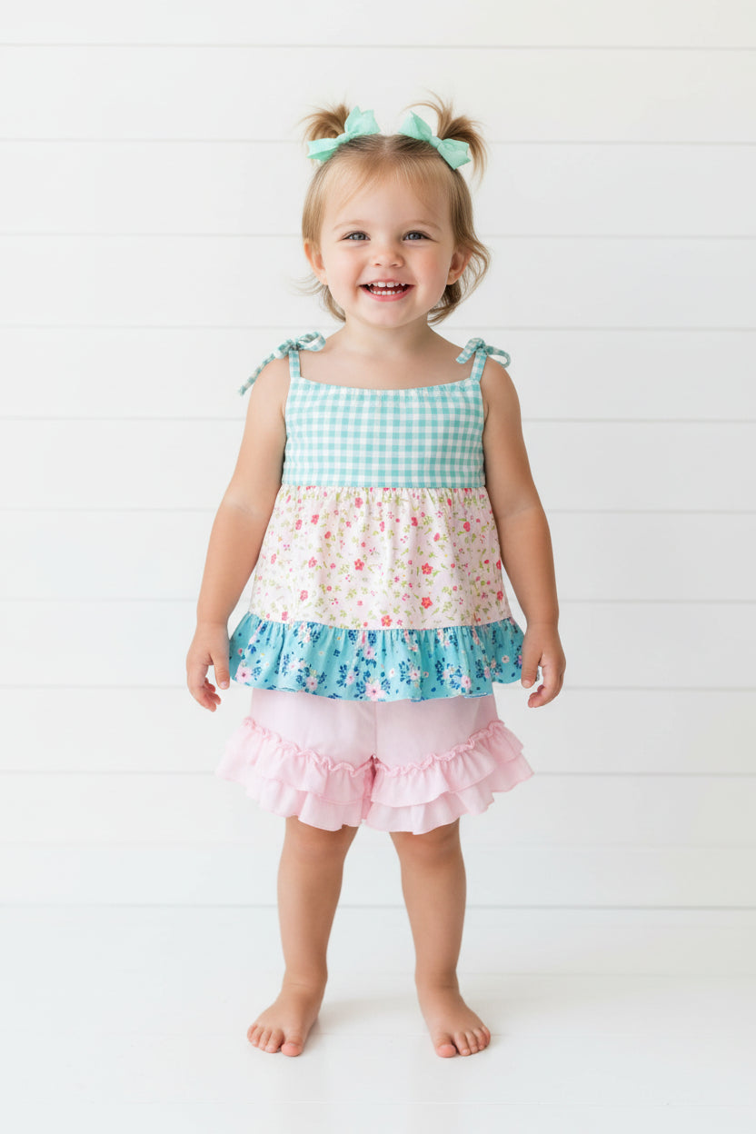 Sleeveless top has blue gingham, pink floral & blue ruffle trim bottom. Pink ruffle shorts has elastic waist and ruffle trim. Milk silk fabric makes this outfit buttery soft and comfy. Add coordinating headband (or bow) to complete the outfit (sold separately)