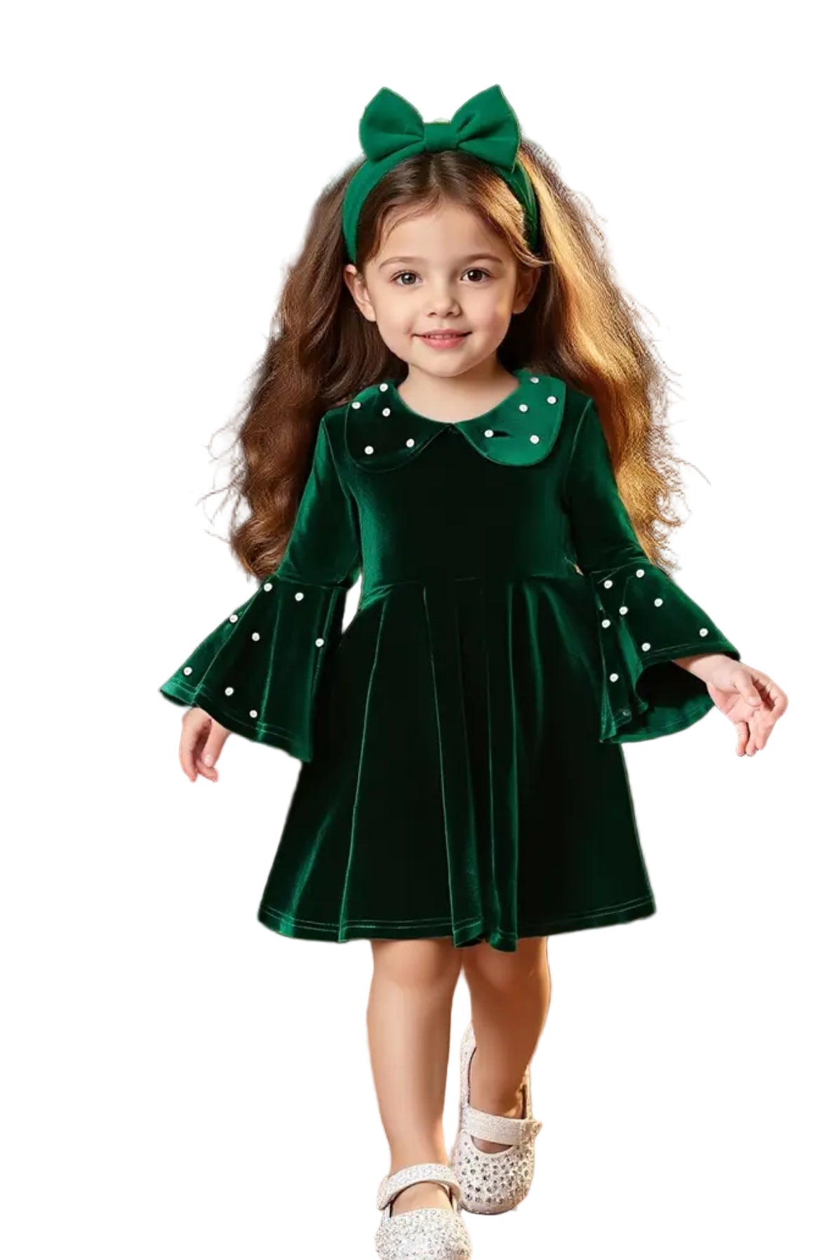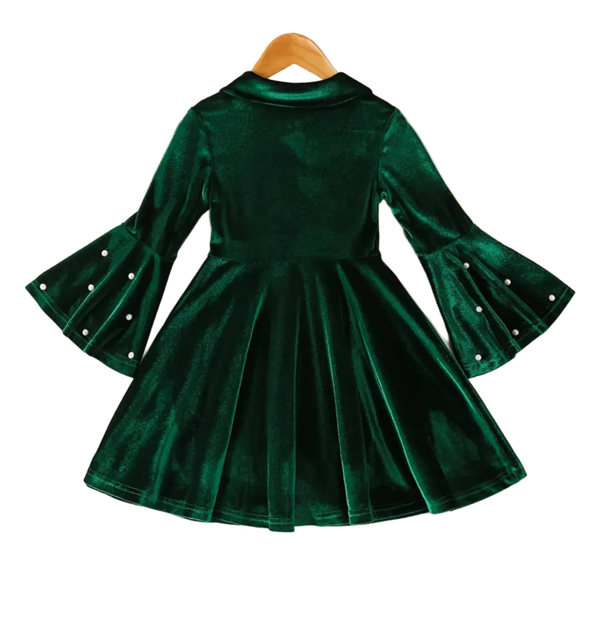 Elegant evergreen velour dress is perfect for holiday events or pictures, wedding or any occasion. Collared neck and bell sleeves have pearl accents. Purchase a coordinating hair bow or headband (sold separately) for a complete look.