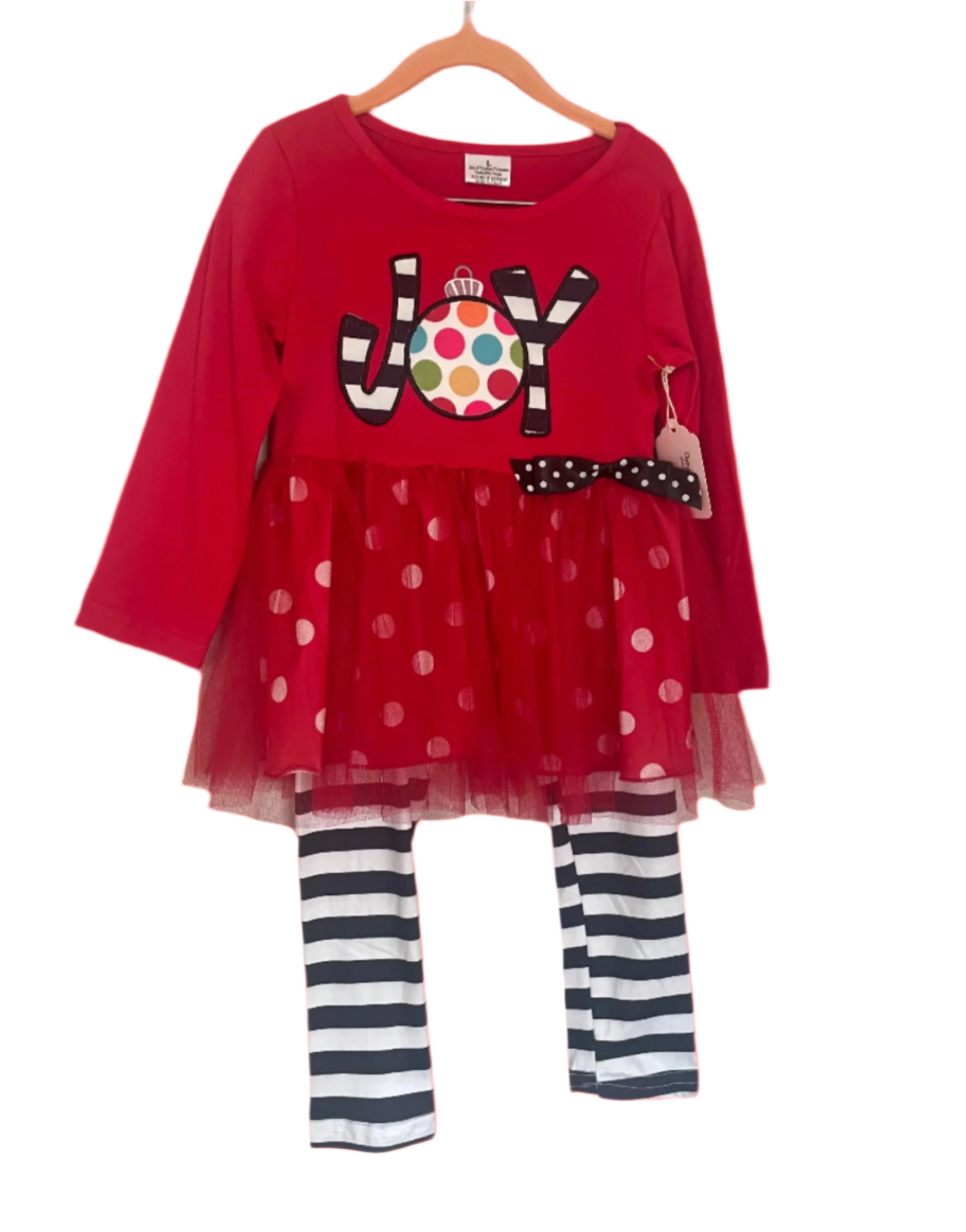Red long sleeve tunic top with polka dot & tulle bottom and JOY applique. Black & white striped leggings coordinate with top. Elastic waist for added comfort.