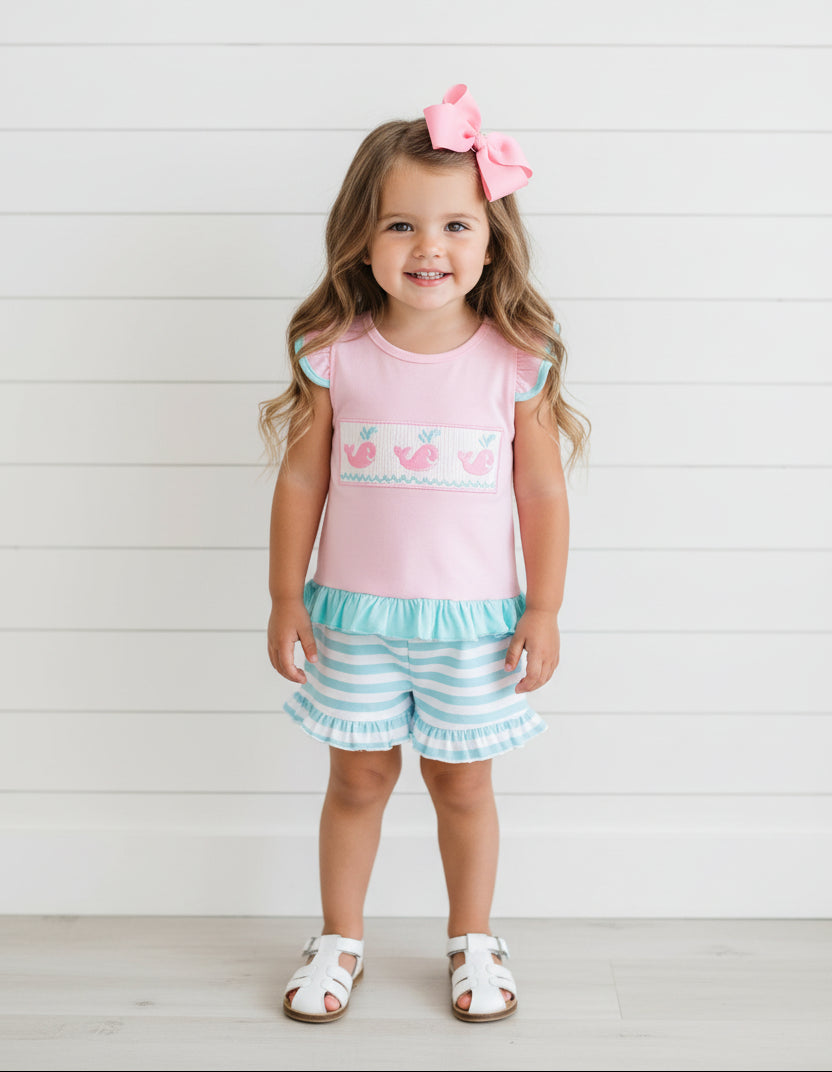 Pink flutter sleeve top has blue ruffle trim at bottom and on sleeve and smocked embroidered whales on chest. Blue and white striped shorts have ruffle trim at bottom and elastic waist.