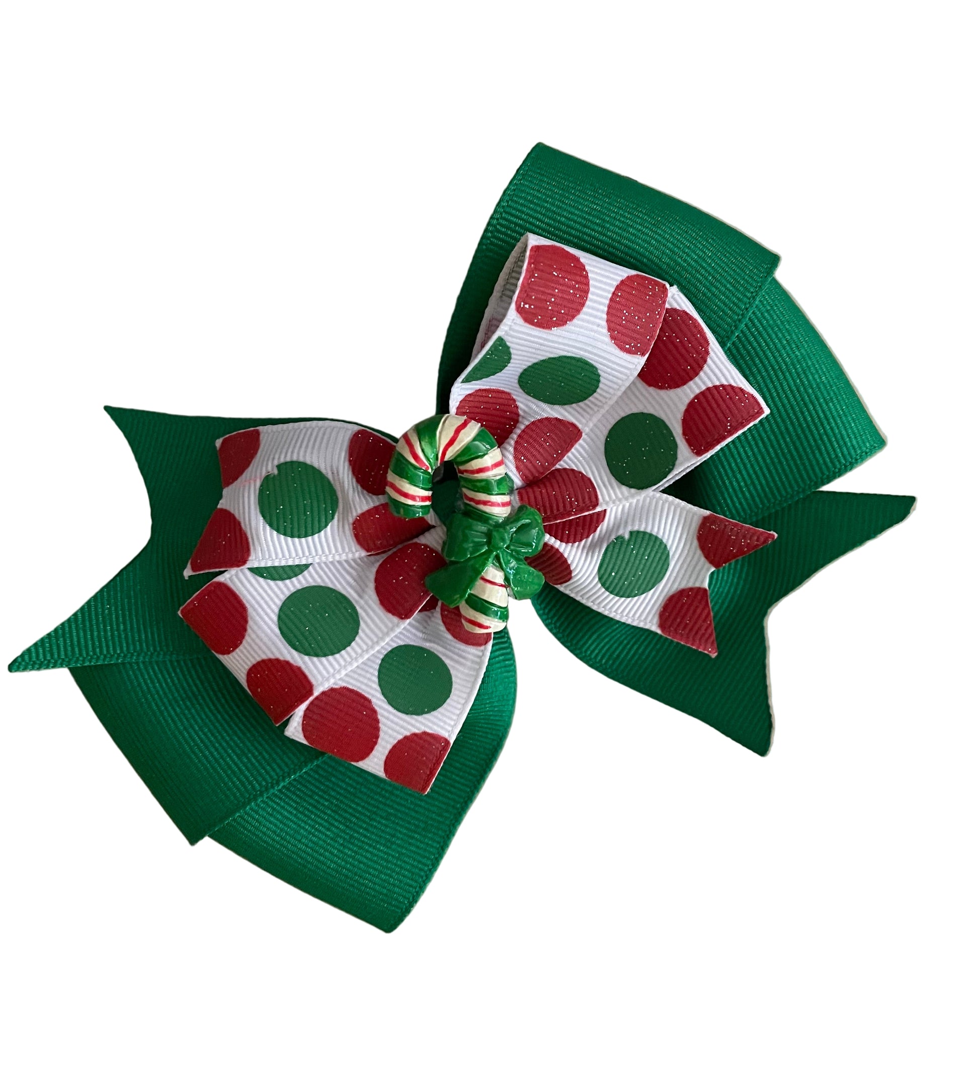 Green 1 1/2" grosgrain bow has a 7/8 inch white ribbon with red & green polka dot design on top. Striped candy cane resin center adds a touch of festive whimsy. Comes on a single-prong alligator clip, lined with a latex-free no slip gripper.