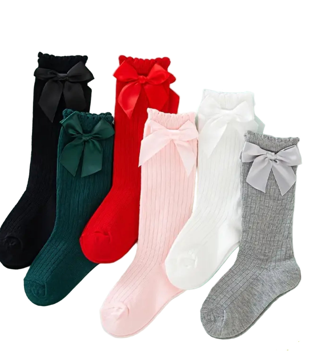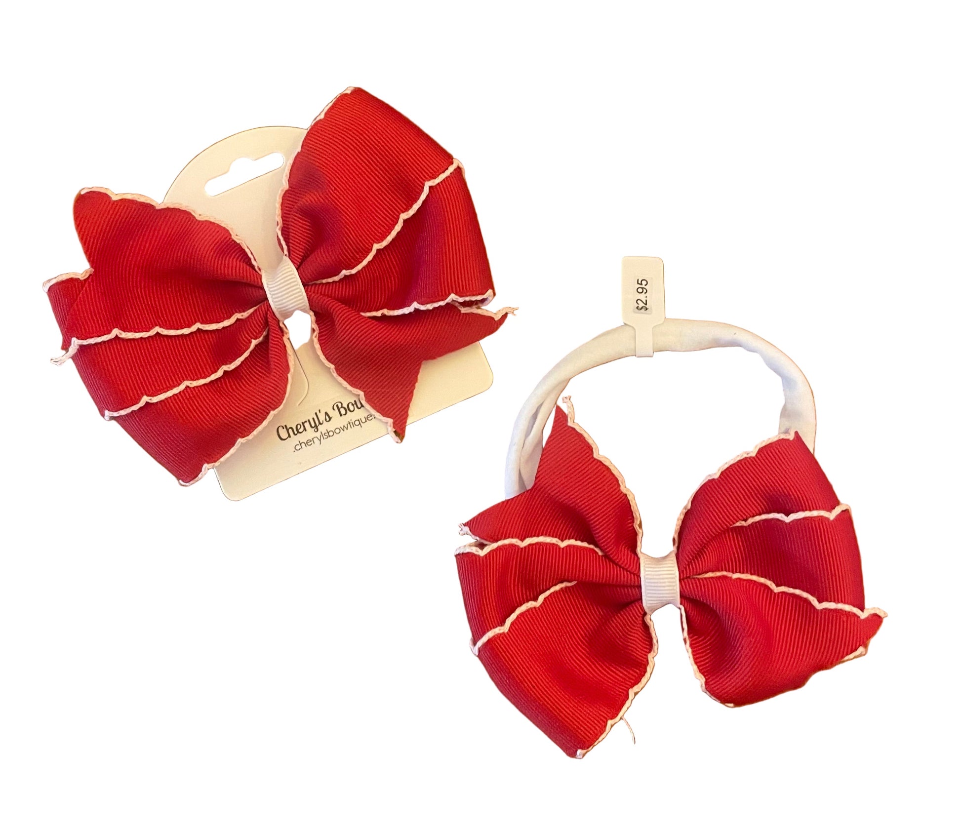 Red lace dress has red taffeta lining underneath and sheer lace bell sleeves. So precious! Add a coordinating hair bow & knee socks for a complete outfit (sold separately & not included in price)